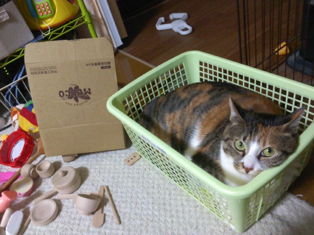 孫のおもちゃ入れにいすわってます